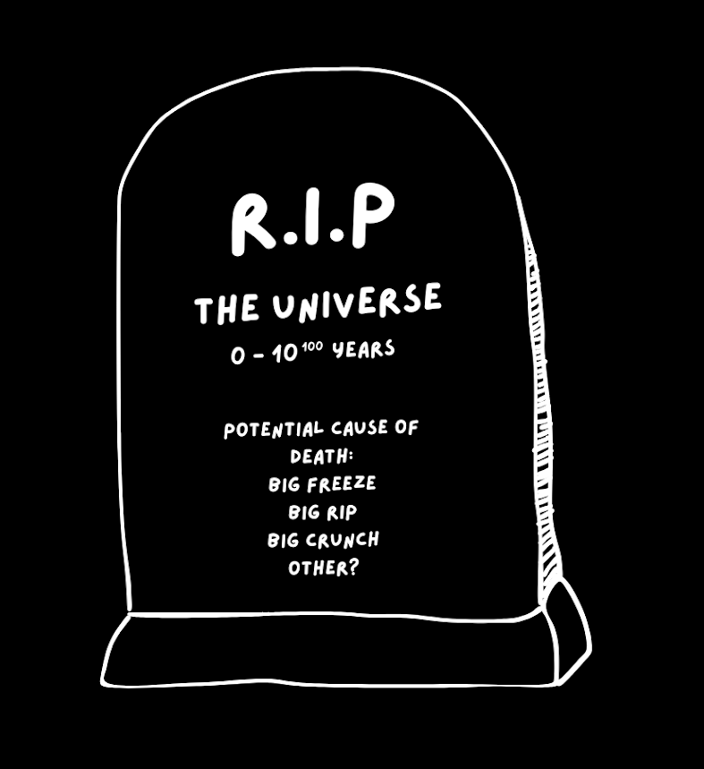 The Big Freeze scenario predicts that galaxies will drift farther apart due to accelerating expansion, causing cosmic temperatures to drop. The Universe will trend toward its maximum entropy — a state of no usable energy. As matter becomes dispersed, the Universe reaches a cold, dark, inert equilibrium. The Big Rip hypothesises that dark energy will continue to accelerate the Universe’s expansion, eventually overcoming all forms of gravitational and atomic binding. The fabric of space could stretch infinitely, with galaxies, stars, planets, and atoms being torn apart—ending the Universe in a catastrophic rupture.